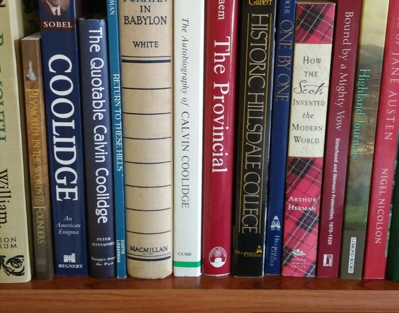 A few books in the history section of our home library, including several about President Calvin Coolidge. Coolidge is worth studying with your children. I wrote a bit about him in this post: Happy Birthday and Fourth of July, Calvin Coolidge!