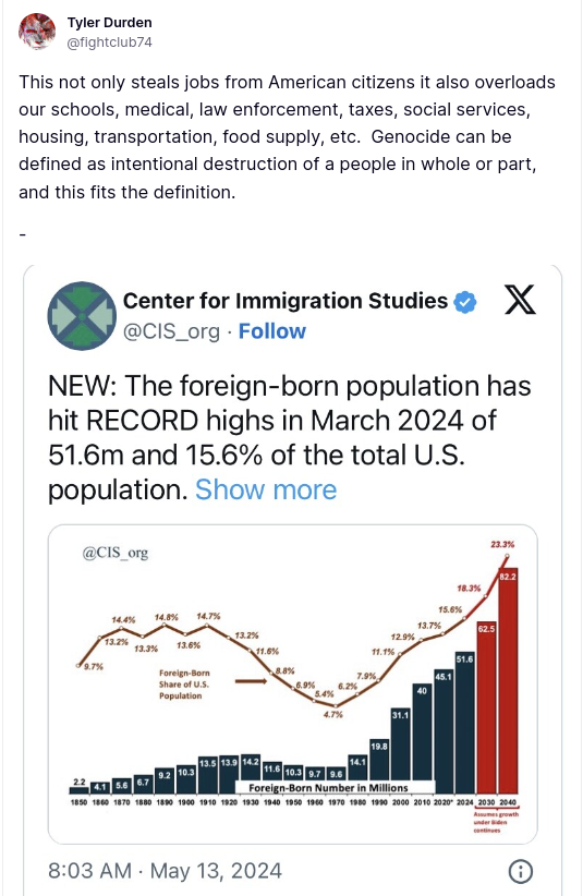 “This not only steals jobs from American citizens it also overloads our schools, medical, law enforcement, taxes, social services, housing, transportation, food supply, etc. Genocide can be defined as intentional destruction of a people in whole or part, and this fits the definition.”