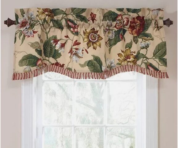 I found the valences on ebay and they are perfect! They are even prettier with richer colors in person. They are Waverly Laurel Springs Parchment Lined Valances.