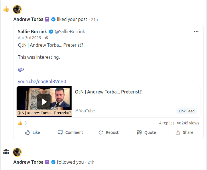 My online friend, Shelly, did a video recently about Andrew Torba and the fact that he sounded like a Preterist. I shared the video on Gab and tagged Andrew. My gab didn’t really go anywhere so I forgot about it. (I’ll embed Shelly’s video at the end of this post.)