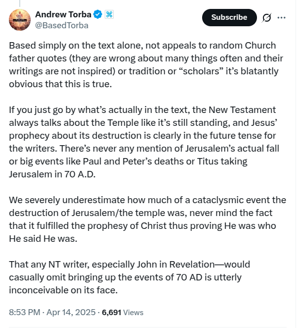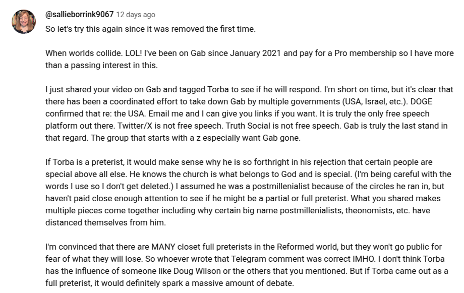 If Torba is a preterist, it would make sense why he is so forthright in his rejection that certain people are special above all else. He knows the church is what belongs to God and is special. (I’m being careful with the words I use so I don’t get deleted.) I assumed he was a postmillenialist because of the circles he ran in, but haven’t paid close enough attention to see if he might be a partial or full preterist. What you shared makes multiple pieces come together including why certain big name postmillenialists, theonomists, etc. have distanced themselves from him.