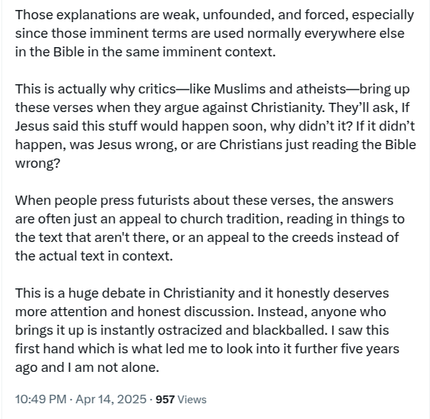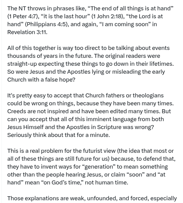 It’s pretty easy to accept that Church fathers or theologians could be wrong on things, because they have been many times. Creeds are not inspired and have been edited many times. But can you accept that all of this imminent language from both Jesus Himself and the Apostles in Scripture was wrong? Seriously think about that for a minute.