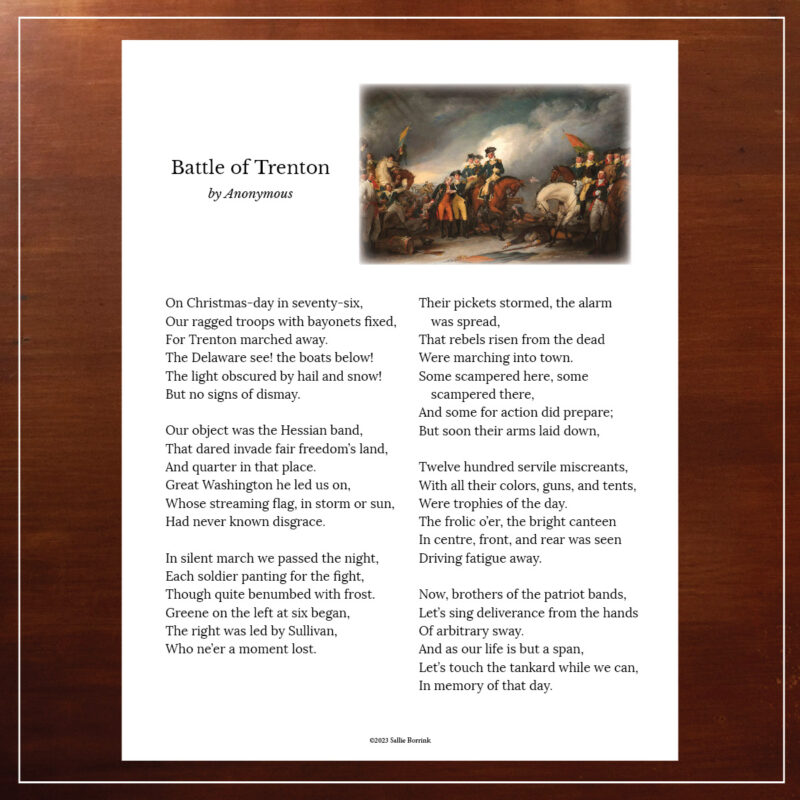 Use the powerful poem “Battle of Trenton” by Anonymous as part of your poetry, George Washington, or Revolutionary War unit. This printable from my shop recalls and celebrates the events of that battle.
