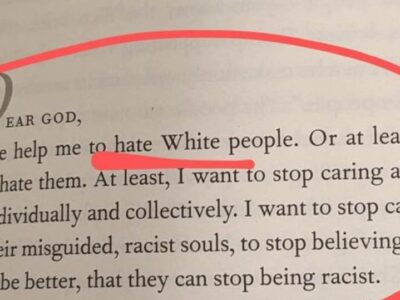 Someone shared photographs of the entire chapter so it can’t be said the quotes are being taken out of context. You can read them in the screenshots in this article linked at the end. It’s also written by, you guessed it, a PROFESSOR OF THEOLOGY, Chinequa Walker-Barnes of Mercer University. “Dear God, Please help me to hate …
