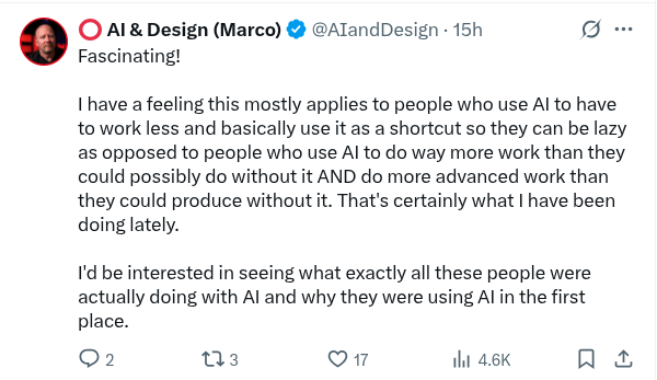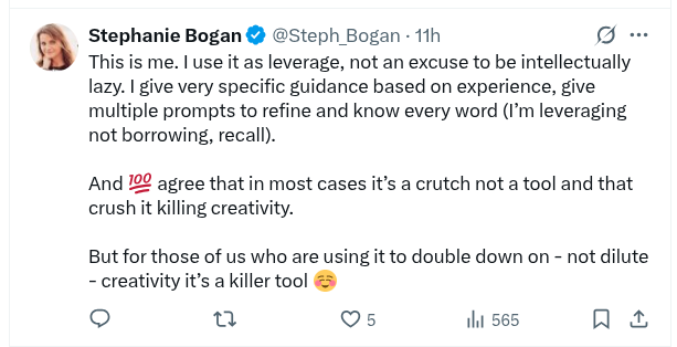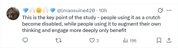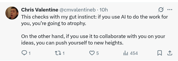 If ChatGPT went dark or away, nothing substantial I do would change. It would take me a little longer to do some tasks here and there. But fundamentally I’d still be writing my own posts in my own words. But people who use it for everything are setting themselves up for a major problem eventually.