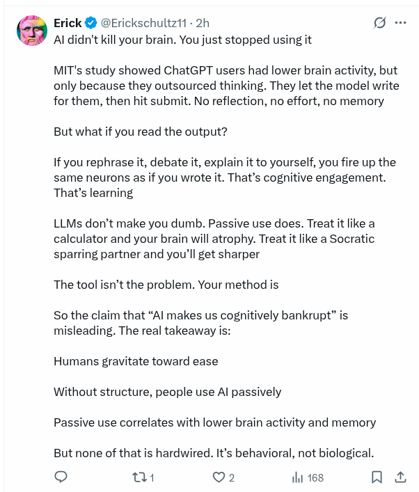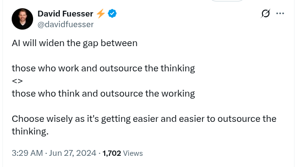 “But when ChatGPT goes dark, what are you left with? Your junior employee is helpless, and the expert knowledge you once had in-house is gone. The ability to write a press release, solve a problem, or think critically without an AI holding your hand is a skill. And like any skill, if you don’t use it, you lose it. The real cost of the AI revolution might not be the jobs we lose, but the abilities we willingly give away.”
