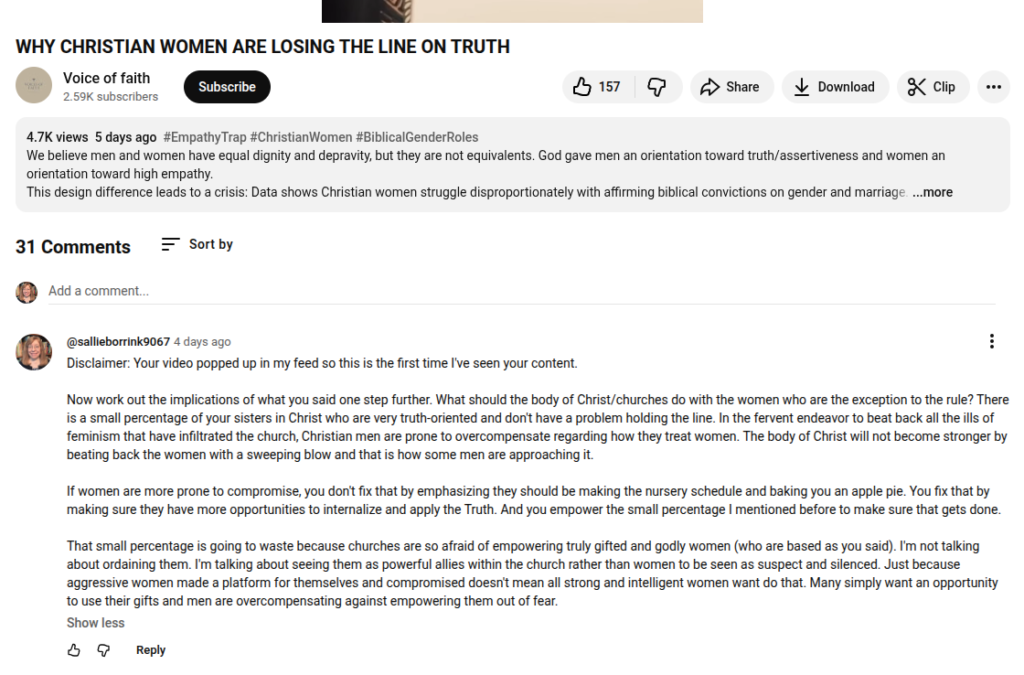 This is very true in what your response was to the video. Many Christian women do feel that way. Thank you for sharing.