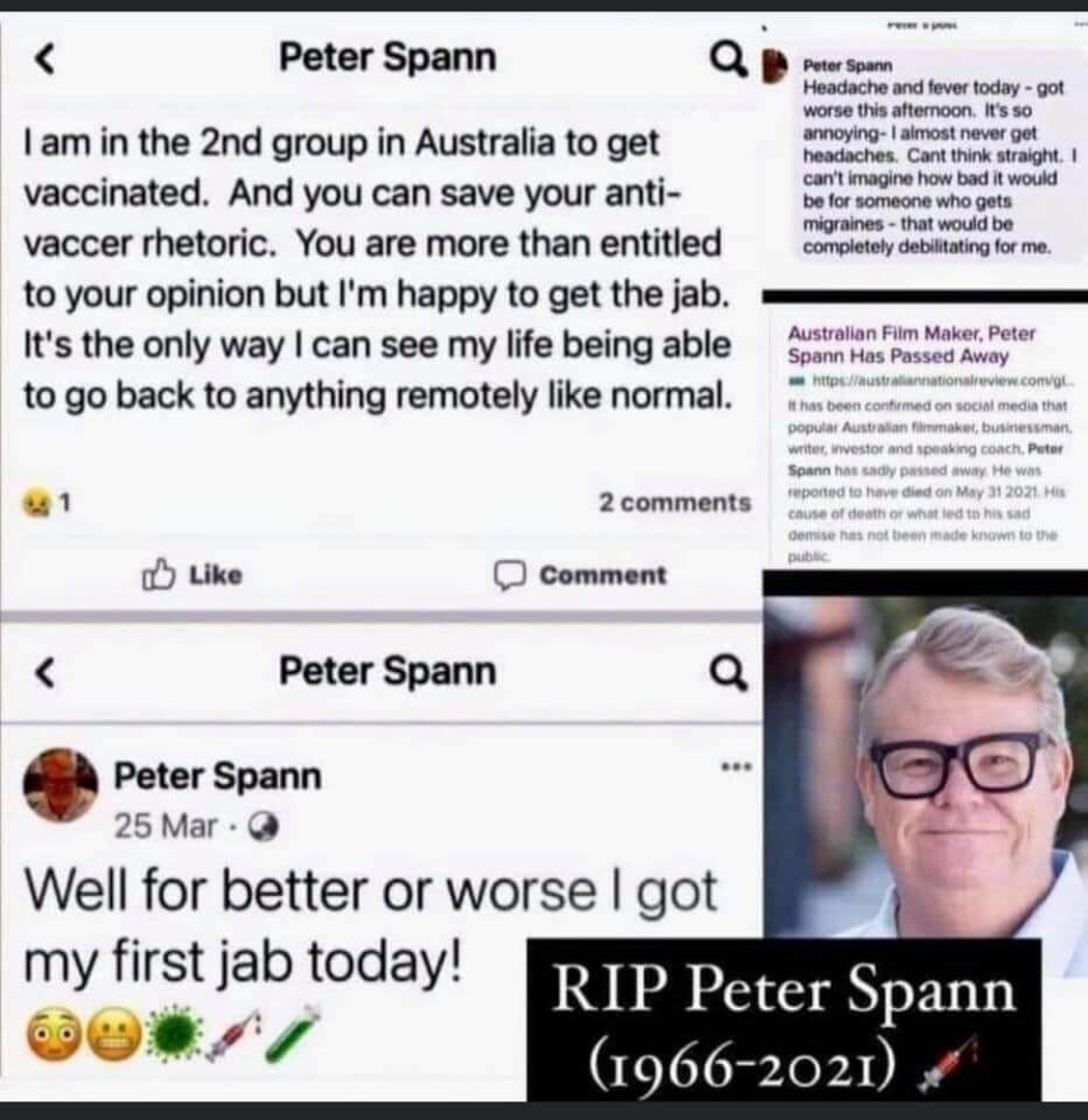 Forum Forums Current Events In The News Coronavirus Australian Filmmake... Notifications Clear all Australian Filmmaker Peter Spann death after Covid vaccine Coronavirus Last Post by Sallie Borrink 5 years ago 1 Posts 1 Users 1 Reactions 1,441 Views RSS Sallie Borrink (@sallie) Posts: 6887 Illustrious Member Admin Topic starter ♥ Wife, homeschooling mom, conspiracy analyst ♥ Posted : Tuesday, June 8, 2021 4:32 pm Amanda reacted Topic Tags COVID Vaccine Deaths Super Globals Requests: Server: Options and Features route: community use_home_url: url: https://sallieborrink.com/community/ pageid:145756 default_groupid: 3 2022
