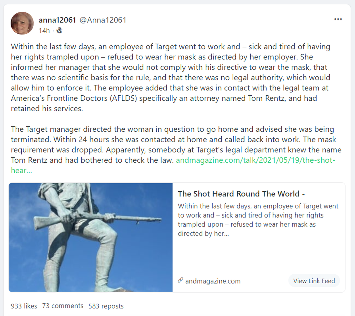 Forum Forums Current Events In The News Coronavirus Can employers reall... Notifications Clear all Can employers really require you to wear a mask? Coronavirus Last Post by Sallie Borrink 5 years ago 1 Posts 1 Users 2 Reactions 886 Views RSS Sallie Borrink (@sallie) Posts: 6885 Illustrious Member Admin Topic starter ♥ Wife, homeschooling mom, conspiracy analyst ♥ Posted : Thursday, May 20, 2021 10:26 pm Amy C and Amanda reacted Topic Tags Masks Super Globals Requests: Server: Options and Features route: community use_home_url: url: https://sallieborrink.com/community/ pageid:145756 default_groupid: 3 2022