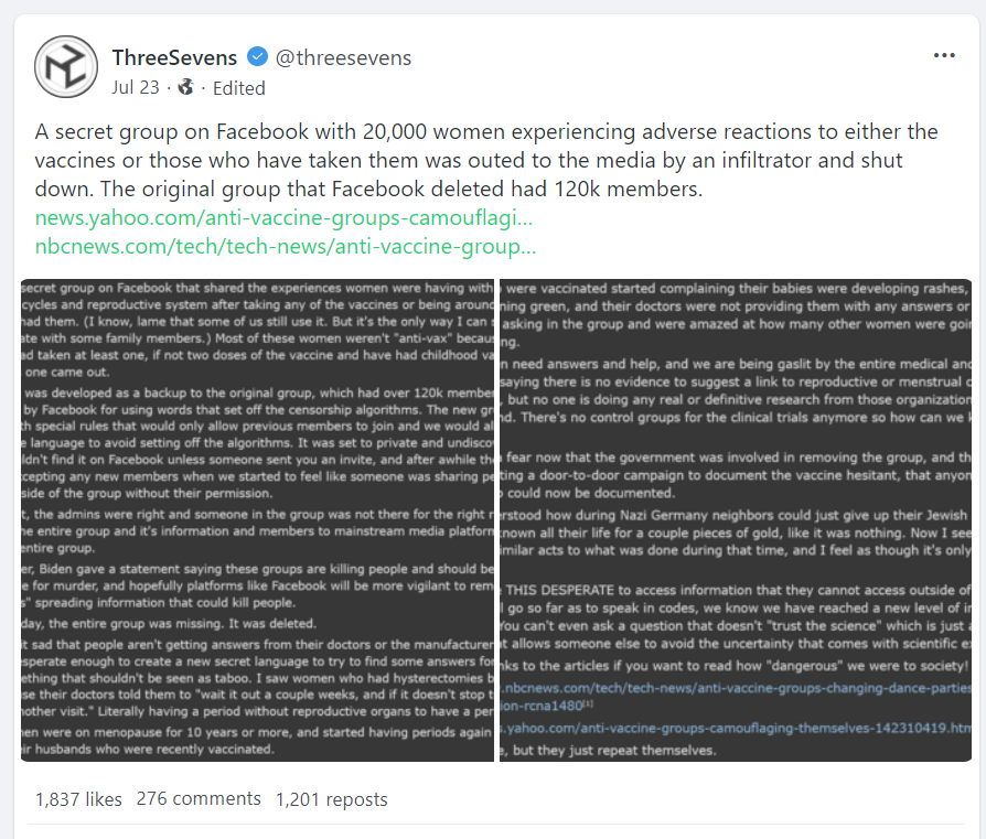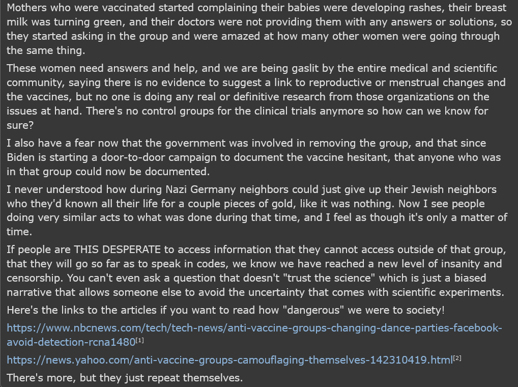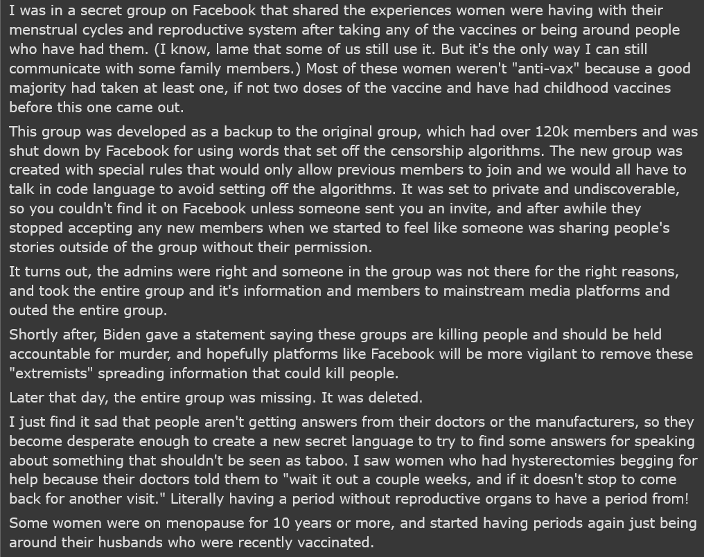 A secret group on Facebook with 20,000 women experiencing adverse reactions to either the vaccines or those who have taken them was outed to the media by an infiltrator and shut down. The original group that Facebook deleted had 120k members.