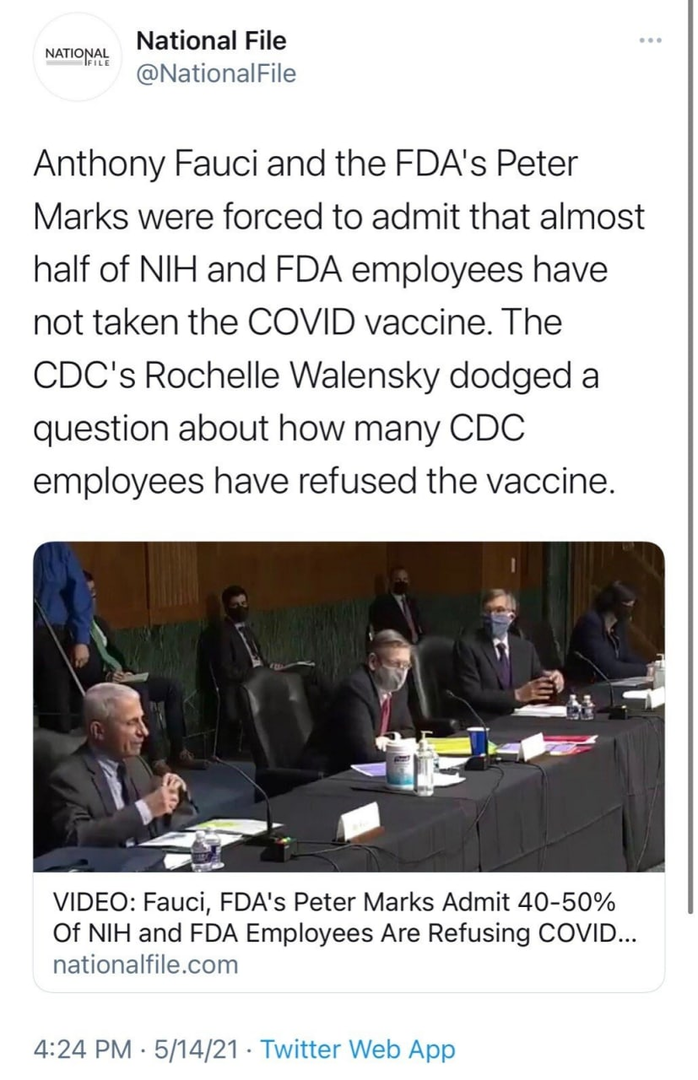 Forum Forums Current Events In The News Coronavirus Fauci and Marks for... Notifications Clear all Fauci and Marks forced to admit HALF of FDA and NIH employees have NOT taken shot Coronavirus Last Post by Sallie Borrink 5 years ago 1 Posts 1 Users 2 Reactions 835 Views RSS Sallie Borrink (@sallie) Posts: 6885 Illustrious Member Admin Topic starter Now why are they not taking the very thing they are creating and promoting? ♥ Wife, homeschooling mom, conspiracy analyst ♥ Posted : Friday, May 14, 2021 7:58 pm Amy C and Amanda reacted Topic Tags Fauci COVID Vaccines Super Globals Requests: Server: Options and Features route: community use_home_url: url: https://sallieborrink.com/community/ pageid:145756 default_groupid: 3 2022