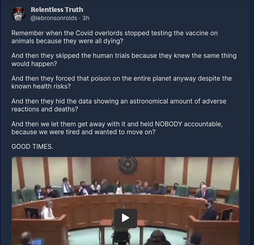 He says: “Folks I think it is important to understand that the American people are the Guinea Pigs, this is the test that is going on.” “They didn’t do the human testing and they stopped the animal tests because the animals were dying and then they turned it out to the public.” “Now we are looking at businesses that want to mandate that this experimental vaccine be given to people as a condition of their employment. Yet we have this death count that continues to rise and be completely ignored.”