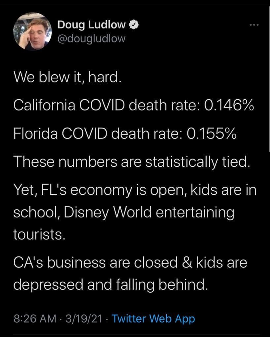 Forum Forums Current Events In The News Coronavirus The Florida vs. Cal... Notifications Clear all The Florida vs. California coronavirus approach and outcome in one statistic Coronavirus Last Post by Sallie Borrink 5 years ago 1 Posts 1 Users 2 Reactions 247 Views RSS Sallie Borrink (@sallie) Posts: 6885 Illustrious Member Admin Topic starter ♥ Wife, homeschooling mom, conspiracy analyst ♥ Posted : Monday, March 29, 2021 8:55 am Amanda and Amy C reacted Super Globals Requests: Server: Options and Features route: community use_home_url: url: https://sallieborrink.com/community/ pageid:145756 default_groupid: 3 2022