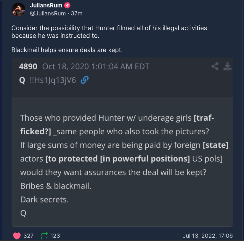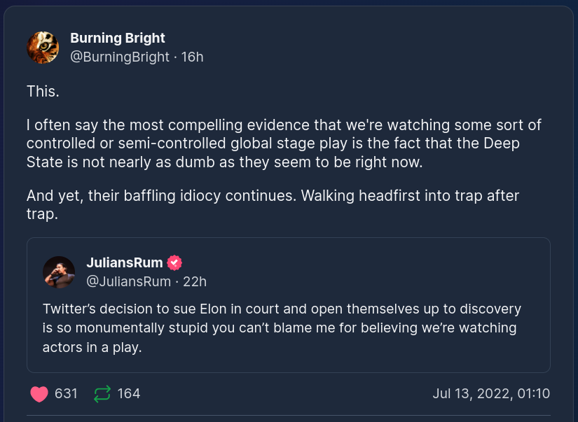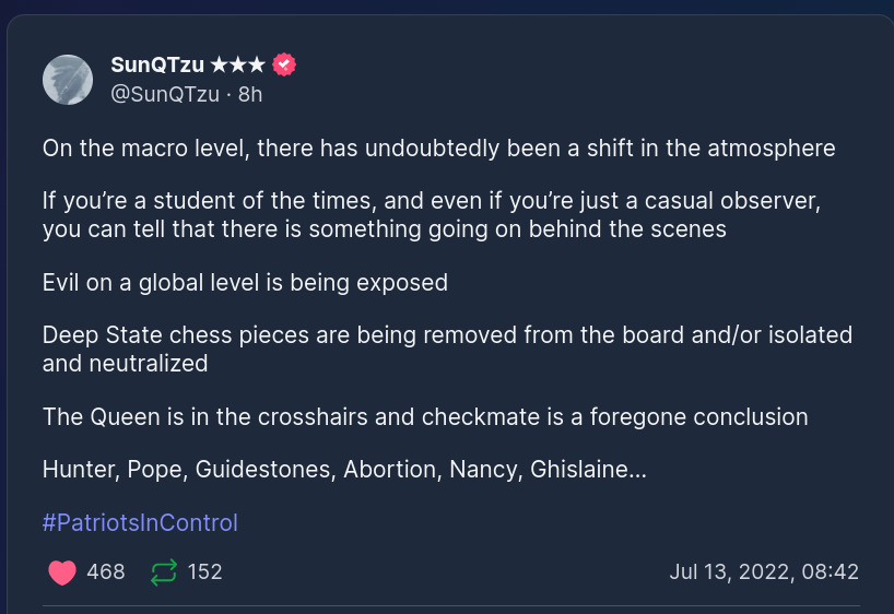 Forum Forums Current Events Everything Q Q Chatter This Week... Notifications Clear all Q Chatter This Week - July 10, 2022 Everything Q Last Post by Sallie Borrink 4 years ago 5 Posts 1 Users 10 Reactions 336 Views RSS Sallie Borrink (@sallie) Posts: 6893 Illustrious Member Admin Topic starter Interesting points I come across this week related to Q and anon. ♥ Wife, homeschooling mom, conspiracy analyst ♥ Posted : Tuesday, July 12, 2022 3:24 pm Amanda and Amy C reacted Sallie Borrink (@sallie) Posts: 6893 Illustrious Member Admin Topic starter ♥ Wife, homeschooling mom, conspiracy analyst ♥ Posted : Tuesday, July 12, 2022 3:25 pm Amanda and Amy C reacted Sallie Borrink (@sallie) Posts: 6893 Illustrious Member Admin Topic starter ♥ Wife, homeschooling mom, conspiracy analyst ♥ Posted : Wednesday, July 13, 2022 4:42 pm Amanda and Amy C reacted Sallie Borrink (@sallie) Posts: 6893 Illustrious Member Admin Topic starter ♥ Wife, homeschooling mom, conspiracy analyst ♥ Posted : Wednesday, July 13, 2022 4:43 pm Amanda and Amy C reacted Sallie Borrink (@sallie) Posts: 6893 Illustrious Member Admin Topic starter ♥ Wife, homeschooling mom, conspiracy analyst ♥ Posted : Wednesday, July 13, 2022 4:44 pm Amanda and Amy C reacted Super Globals Requests: Server: Options and Features route: community use_home_url: url: https://sallieborrink.com/community/ pageid:145756 default_groupid: 3 2022