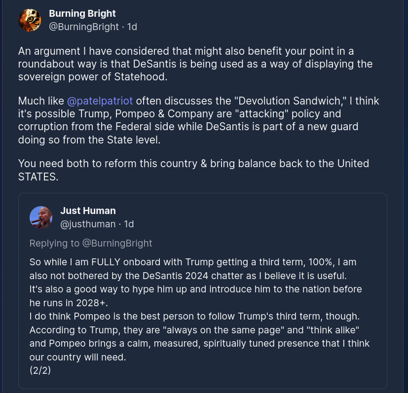 I think it's been very clear that the primary role DeSantis has been playing the past few years is highlighting in HUGE LIGHTS and BRIGHT COLORS what it means to have state leadership lead their individual state. Everyone has seen clear as day not only via Florida but also NY, MI, GA, CA, etc. that it really does matter who holds all of these positions in your state.