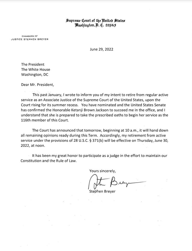 Justice Breyer informs The President he will officially retire tomorrow at noon.