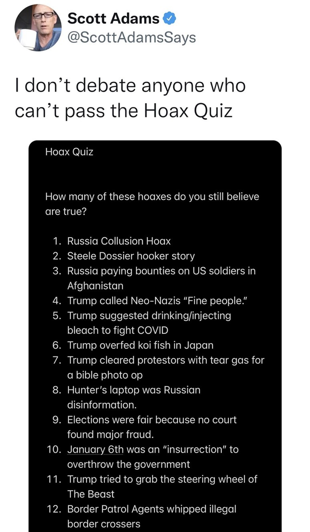 Forum Forums Current Events In The News A List of the Trump... Notifications Clear all A List of the Trump Hoaxes In The News Last Post by Sallie Borrink 3 years ago 1 Posts 1 Users 2 Reactions 240 Views RSS Sallie Borrink (@sallie) Posts: 6894 Illustrious Member Admin Topic starter You know these are all hoaxes and all have been clearly refuted, right? ♥ Wife, homeschooling mom, conspiracy analyst ♥ Posted : Wednesday, August 24, 2022 8:37 pm Amanda and David reacted Super Globals Requests: Server: Options and Features route: community use_home_url: url: https://sallieborrink.com/community/ pageid:145756 default_groupid: 3 2022
