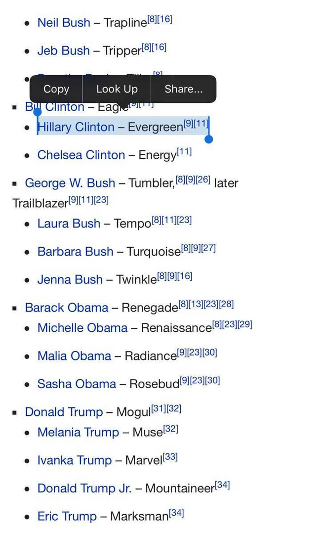 This list of Secret Service names was shared yesterday on Telegram. Note that Hillary is Evergreen. I saw speculation that Evergreen shipping is a front for human trafficking. I have no idea if this is true. I'm just putting this here for future reference. There are several drops related to this as well.
