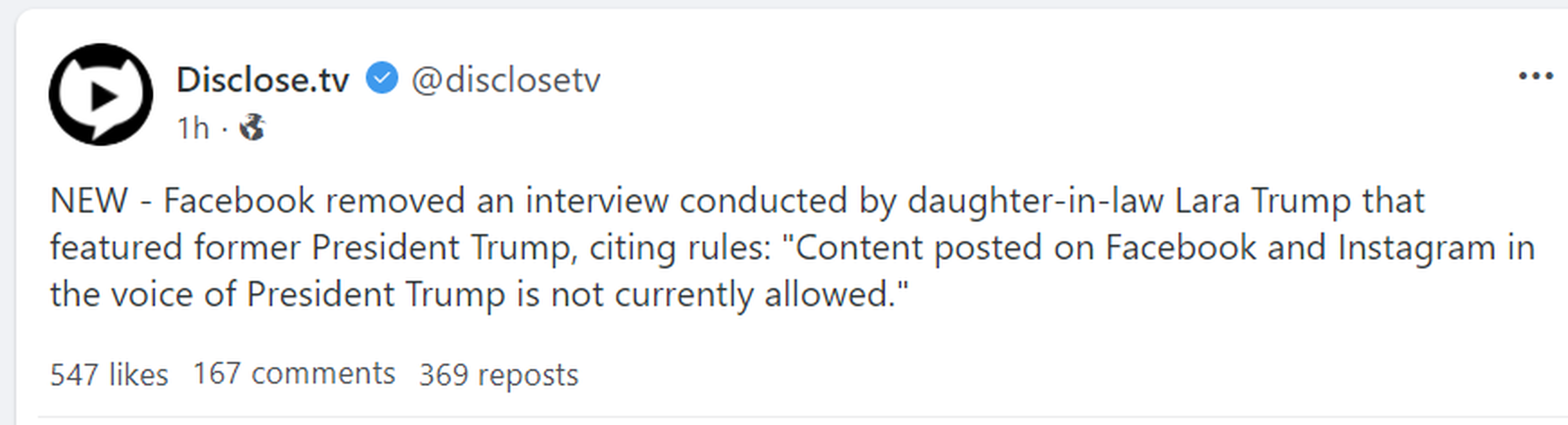 Forum Forums Current Events In The News "Content posted on ... Notifications Clear all "Content posted on Facebook and Instagram in the voice of President Trump is not currently allowed." (NOT satire) In The News Last Post by Amanda 5 years ago 2 Posts 2 Users 2 Reactions 292 Views RSS Sallie Borrink (@sallie) Posts: 6885 Illustrious Member Admin Topic starter https://nationalfile.com/breaking-facebook-bans-trumps-interview-with-lara-trump-does-not-allow-voice-of-president-trump/ ♥ Wife, homeschooling mom, conspiracy analyst ♥ Posted : Wednesday, March 31, 2021 10:54 am Amy C and Amanda reacted Topic Tags Facebook Amanda (@amanda) Posts: 73 Trusted Member Registered {yellow}:amazed: Posted : Wednesday, March 31, 2021 12:53 pm Super Globals Requests: Server: Options and Features route: community use_home_url: url: https://sallieborrink.com/community/ pageid:145756 default_groupid: 3 2022