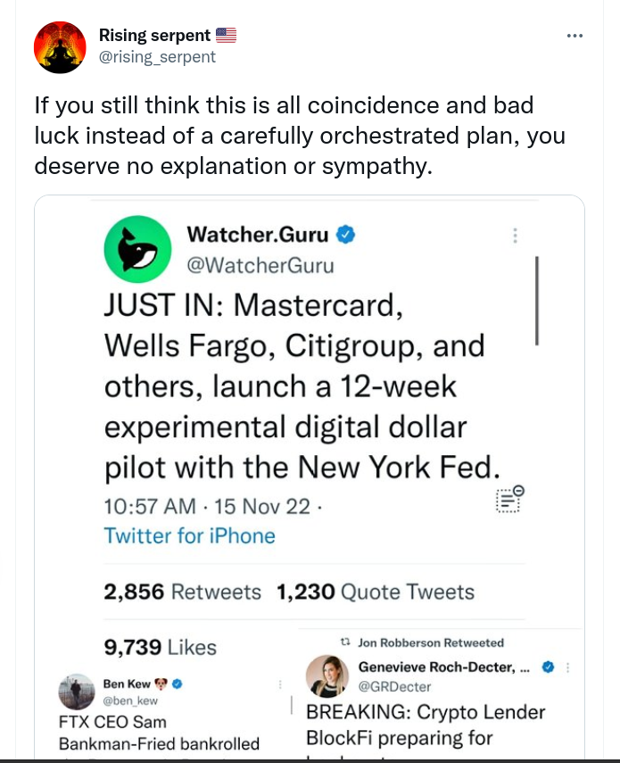 Forum Forums Current Events In The News FTX and Crypto Coll... Notifications Clear all FTX and Crypto Collapse (Ongoing Thread) Page 10 / 11 Prev 1 2 3 4 5 6 7 8 9 10 11 Next In The News Last Post by Sallie Borrink 3 years ago 82 Posts 2 Users 10 Reactions 627 Views RSS Sallie Borrink (@sallie) Posts: 6894 Illustrious Member Admin Topic starter ♥ Wife, homeschooling mom, conspiracy analyst ♥ Posted : Monday, November 14, 2022 8:47 pm Sallie Borrink (@sallie) Posts: 6894 Illustrious Member Admin Topic starter Take this one for what it's worth. Probably a lot of facts and who knows about some of it. ♥ Wife, homeschooling mom, conspiracy analyst ♥ Posted : Monday, November 14, 2022 8:53 pm Sallie Borrink (@sallie) Posts: 6894 Illustrious Member Admin Topic starter ♥ Wife, homeschooling mom, conspiracy analyst ♥ Posted : Monday, November 14, 2022 8:53 pm Sallie Borrink (@sallie) Posts: 6894 Illustrious Member Admin Topic starter ♥ Wife, homeschooling mom, conspiracy analyst ♥ Posted : Monday, November 14, 2022 9:45 pm Sallie Borrink (@sallie) Posts: 6894 Illustrious Member Admin Topic starter ♥ Wife, homeschooling mom, conspiracy analyst ♥ Posted : Monday, November 14, 2022 9:51 pm Sallie Borrink (@sallie) Posts: 6894 Illustrious Member Admin Topic starter ♥ Wife, homeschooling mom, conspiracy analyst ♥ Posted : Tuesday, November 15, 2022 10:53 am Sallie Borrink (@sallie) Posts: 6894 Illustrious Member Admin Topic starter ♥ Wife, homeschooling mom, conspiracy analyst ♥ Posted : Tuesday, November 15, 2022 4:39 pm Sallie Borrink (@sallie) Posts: 6894 Illustrious Member Admin Topic starter ♥ Wife, homeschooling mom, conspiracy analyst ♥ Posted : Thursday, November 17, 2022 9:25 am Page 10 / 11 Prev 1 2 3 4 5 6 7 8 9 10 11 Next Super Globals Requests: Server: Options and Features route: community use_home_url: url: https://sallieborrink.com/community/ pageid:145756 default_groupid: 3 2022