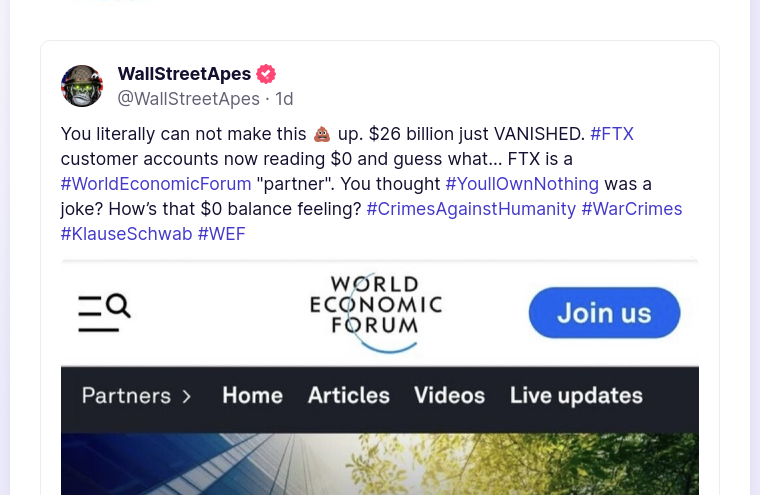 Forum Forums Current Events In The News FTX and Crypto Coll... Notifications Clear all FTX and Crypto Collapse (Ongoing Thread) Page 7 / 11 Prev 1 2 3 4 5 6 7 8 9 10 11 Next In The News Last Post by Sallie Borrink 3 years ago 82 Posts 2 Users 10 Reactions 632 Views RSS Sallie Borrink (@sallie) Posts: 6894 Illustrious Member Admin Topic starter ♥ Wife, homeschooling mom, conspiracy analyst ♥ Posted : Sunday, November 13, 2022 8:25 pm Sallie Borrink (@sallie) Posts: 6894 Illustrious Member Admin Topic starter ♥ Wife, homeschooling mom, conspiracy analyst ♥ Posted : Sunday, November 13, 2022 8:25 pm Sallie Borrink (@sallie) Posts: 6894 Illustrious Member Admin Topic starter ♥ Wife, homeschooling mom, conspiracy analyst ♥ Posted : Sunday, November 13, 2022 8:29 pm Sallie Borrink (@sallie) Posts: 6894 Illustrious Member Admin Topic starter ♥ Wife, homeschooling mom, conspiracy analyst ♥ Posted : Sunday, November 13, 2022 11:03 pm Sallie Borrink (@sallie) Posts: 6894 Illustrious Member Admin Topic starter ♥ Wife, homeschooling mom, conspiracy analyst ♥ Posted : Sunday, November 13, 2022 11:04 pm Sallie Borrink (@sallie) Posts: 6894 Illustrious Member Admin Topic starter ♥ Wife, homeschooling mom, conspiracy analyst ♥ Posted : Sunday, November 13, 2022 11:05 pm Sallie Borrink (@sallie) Posts: 6894 Illustrious Member Admin Topic starter ♥ Wife, homeschooling mom, conspiracy analyst ♥ Posted : Monday, November 14, 2022 9:34 am Sallie Borrink (@sallie) Posts: 6894 Illustrious Member Admin Topic starter ♥ Wife, homeschooling mom, conspiracy analyst ♥ Posted : Monday, November 14, 2022 9:34 am Page 7 / 11 Prev 1 2 3 4 5 6 7 8 9 10 11 Next Super Globals Requests: Server: Options and Features route: community use_home_url: url: https://sallieborrink.com/community/ pageid:145756 default_groupid: 3 2022