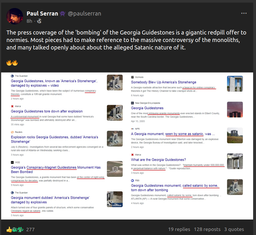 Forum Forums Current Events In The News Georgia Guidestones... Notifications Clear all Georgia Guidestones Partially Destroyed By Blast, Subsequently Demolished (ongoing coverage) Page 3 / 3 Prev 1 2 3 In The News Last Post by Sallie Borrink 4 years ago 21 Posts 1 Users 5 Reactions 830 Views RSS Sallie Borrink (@sallie) Posts: 6885 Illustrious Member Admin Topic starter ♥ Wife, homeschooling mom, conspiracy analyst ♥ Posted : Thursday, July 7, 2022 8:30 am Amanda reacted Sallie Borrink (@sallie) Posts: 6885 Illustrious Member Admin Topic starter ♥ Wife, homeschooling mom, conspiracy analyst ♥ Posted : Thursday, July 7, 2022 8:30 am Amanda reacted Sallie Borrink (@sallie) Posts: 6885 Illustrious Member Admin Topic starter ♥ Wife, homeschooling mom, conspiracy analyst ♥ Posted : Thursday, July 7, 2022 8:40 am Amanda reacted Sallie Borrink (@sallie) Posts: 6885 Illustrious Member Admin Topic starter ♥ Wife, homeschooling mom, conspiracy analyst ♥ Posted : Thursday, July 7, 2022 11:53 am Amanda reacted Sallie Borrink (@sallie) Posts: 6885 Illustrious Member Admin Topic starter ♥ Wife, homeschooling mom, conspiracy analyst ♥ Posted : Thursday, July 7, 2022 3:00 pm Page 3 / 3 Prev 1 2 3 Super Globals Requests: Server: Options and Features route: community use_home_url: url: https://sallieborrink.com/community/ pageid:145756 default_groupid: 3 2022
