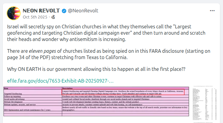 · Profiled for further outreach or data analysis, often without the user ever realizing it.This is not a private PR campaign, this is funded by the Israeli government and filed under FARA. A foreign state is spending millions to shape U.S. Christian opinion with military-grade psychological ops tech.