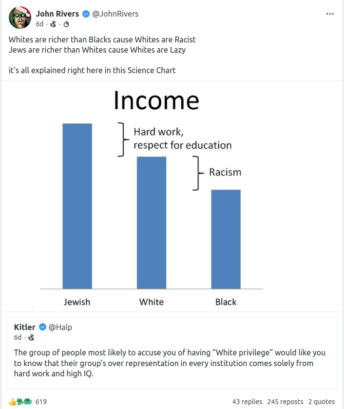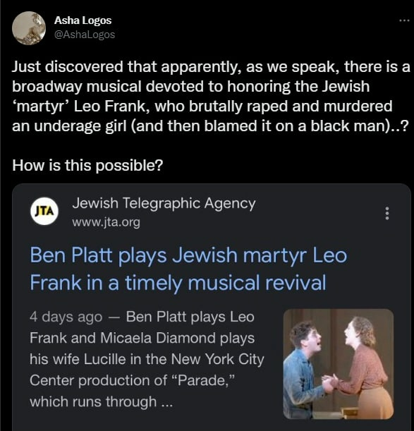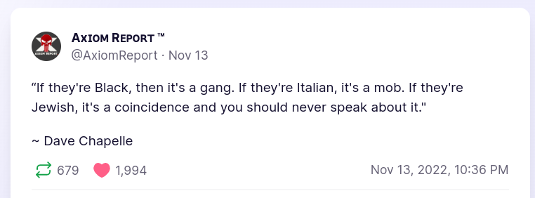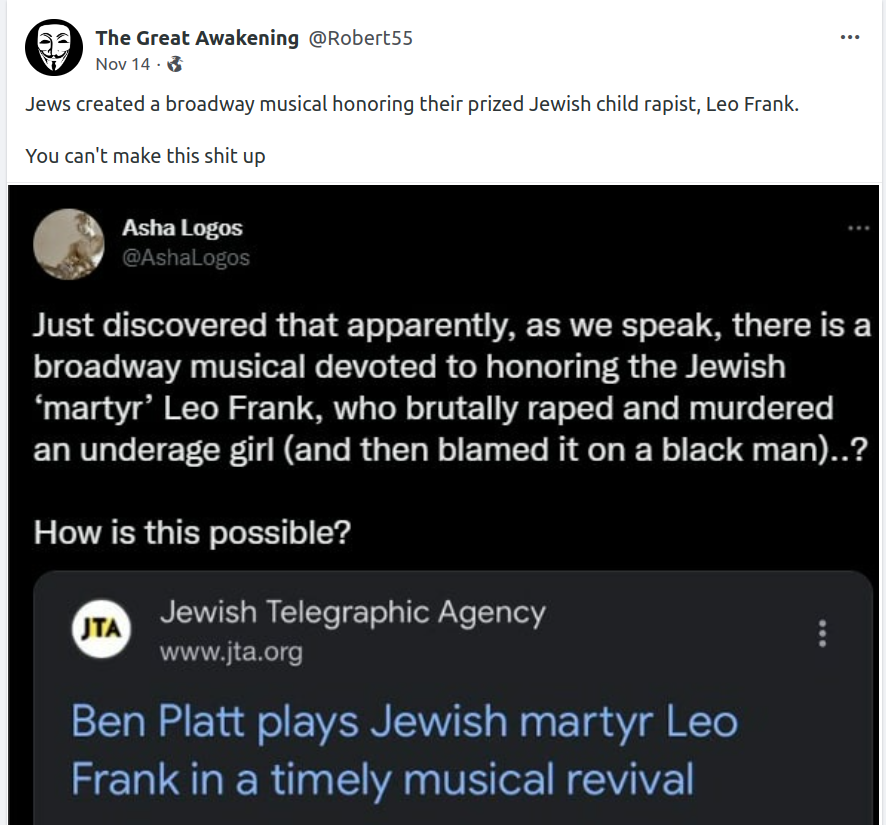 Forum Forums Current Events In The News EXPANDED: Kanye, Ky... Notifications Clear all EXPANDED: Kanye, Kyrie, Elon and The ADL/Jews (Ongoing MEGA Resource Thread) Page 23 / 24 Prev 1 2 3 4 5 6 7 8 9 10 11 12 13 14 15 16 17 18 19 20 21 22 23 24 Next In The News Last Post by Sallie Borrink 3 years ago 187 Posts 2 Users 19 Reactions 1,568 Views RSS Sallie Borrink (@sallie) Posts: 6885 Illustrious Member Admin Topic starter There has been a lot of discussion and arguing about certain stereotypes. This kind of sums it up. ♥ Wife, homeschooling mom, conspiracy analyst ♥ Posted : Monday, November 21, 2022 9:46 am Sallie Borrink (@sallie) Posts: 6885 Illustrious Member Admin Topic starter It is interesting that it is black men who have been in the front of this discussion. I did not have that on my 2022 bingo card. ♥ Wife, homeschooling mom, conspiracy analyst ♥ Posted : Monday, November 21, 2022 9:47 am Sallie Borrink (@sallie) Posts: 6885 Illustrious Member Admin Topic starter This is related to the ADL story I shared earlier re: the KKK members who came to the defense of a black man who was wrongly accused. ♥ Wife, homeschooling mom, conspiracy analyst ♥ Posted : Monday, November 21, 2022 9:48 am Sallie Borrink (@sallie) Posts: 6885 Illustrious Member Admin Topic starter ♥ Wife, homeschooling mom, conspiracy analyst ♥ Posted : Monday, November 21, 2022 9:49 am Sallie Borrink (@sallie) Posts: 6885 Illustrious Member Admin Topic starter Whether you agree with his take or not, they are losing control of the narrative. ♥ Wife, homeschooling mom, conspiracy analyst ♥ Posted : Monday, November 21, 2022 9:50 am Sallie Borrink (@sallie) Posts: 6885 Illustrious Member Admin Topic starter The comedian, Dave Chappelle, did a big show and touched on a lot of these themes. That's what this is referring to. ♥ Wife, homeschooling mom, conspiracy analyst ♥ Posted : Monday, November 21, 2022 9:52 am Sallie Borrink (@sallie) Posts: 6885 Illustrious Member Admin Topic starter ♥ Wife, homeschooling mom, conspiracy analyst ♥ Posted : Monday, November 21, 2022 9:52 am Sallie Borrink (@sallie) Posts: 6885 Illustrious Member Admin Topic starter ♥ Wife, homeschooling mom, conspiracy analyst ♥ Posted : Monday, November 21, 2022 9:53 am Page 23 / 24 Prev 1 2 3 4 5 6 7 8 9 10 11 12 13 14 15 16 17 18 19 20 21 22 23 24 Next Super Globals Requests: Server: Options and Features route: community use_home_url: url: https://sallieborrink.com/community/ pageid:145756 default_groupid: 3 2022