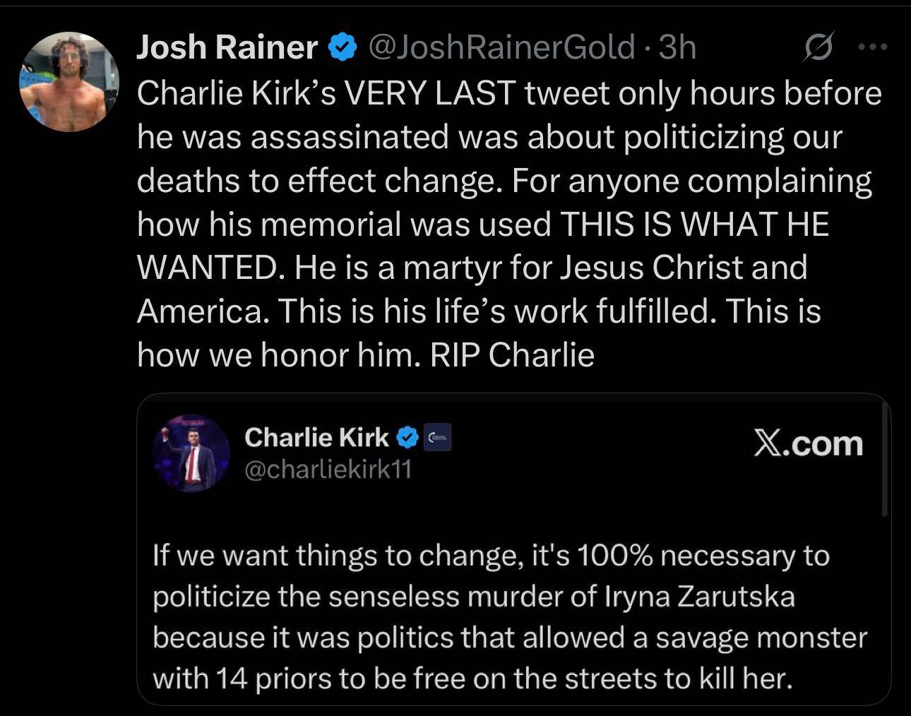 Forum Forums Current Events In The News Politicizing Charli... Notifications Clear all Politicizing Charlie Kirk's Death In The News Last Post by Sallie Borrink 4 months ago 1 Posts 1 Users 0 Reactions 81 Views RSS Sallie Borrink (@sallie) Posts: 6885 Illustrious Member Admin Topic starter I remember seeing his last tweet going around. Someone made this observation. ♥ Wife, homeschooling mom, conspiracy analyst ♥ Posted : Monday, September 22, 2025 10:35 am Super Globals Requests: Server: Options and Features route: community use_home_url: url: https://sallieborrink.com/community/ pageid:145756 default_groupid: 3 2022