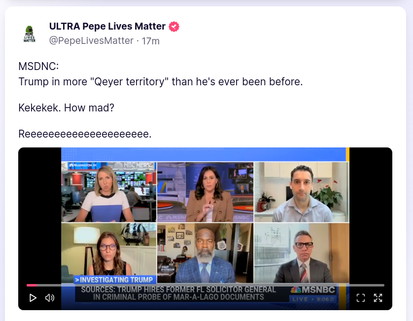 Link for video: https://truthsocial.com/@PepeLivesMatter/posts/108912780287537540