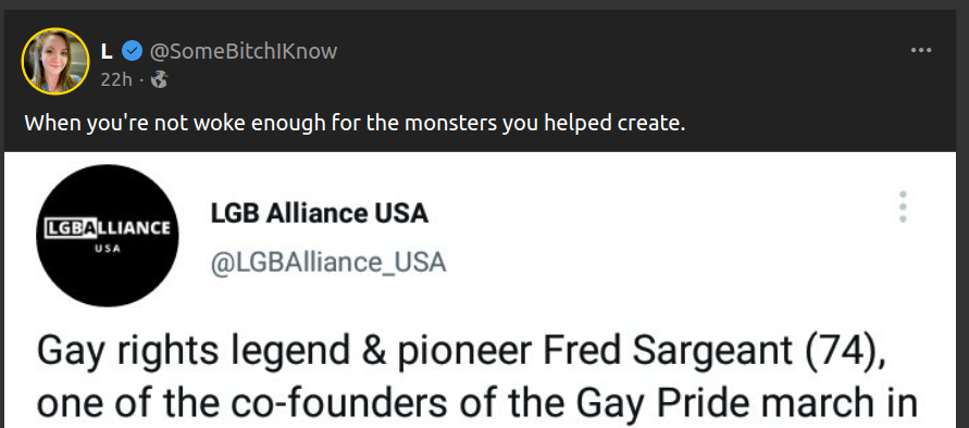 I remember watching a lesbian on Tucker Carlson a few years ago, discussing this type of thing. Lesbians were being pushed out of the organizations they had created. I also watched other early feminists who were alarmed at what was happening. No idea how this will shake out, but that entire alphabet soup part of society is bitterly divided. It is not one monolithic whole.