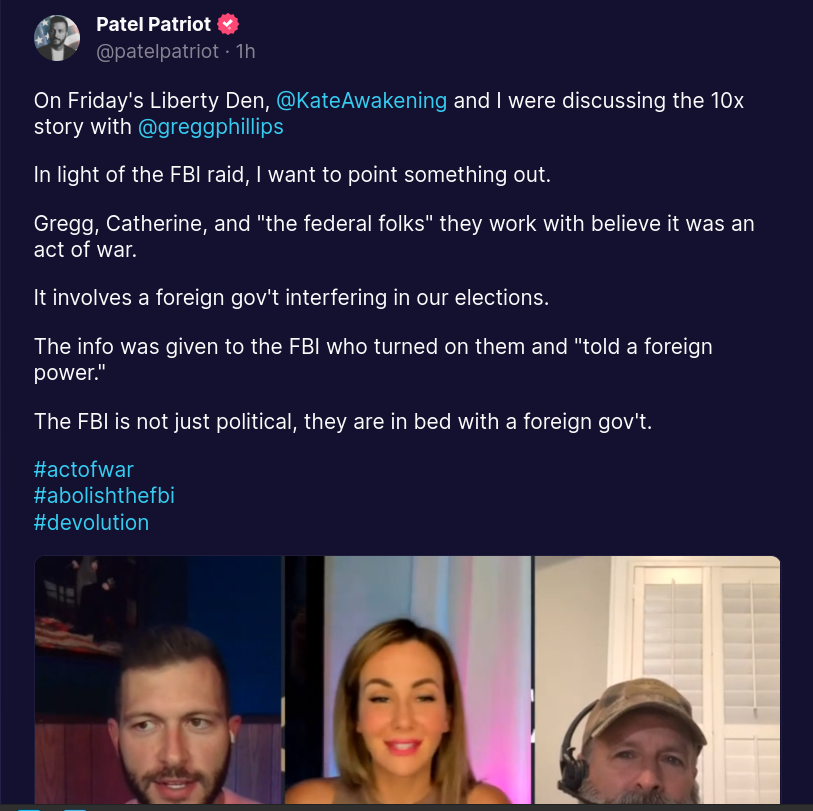 Link to watch video: https://truthsocial.com/@patelpatriot/posts/108793436080227310