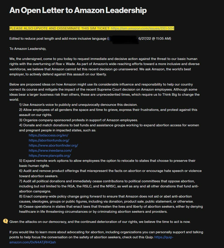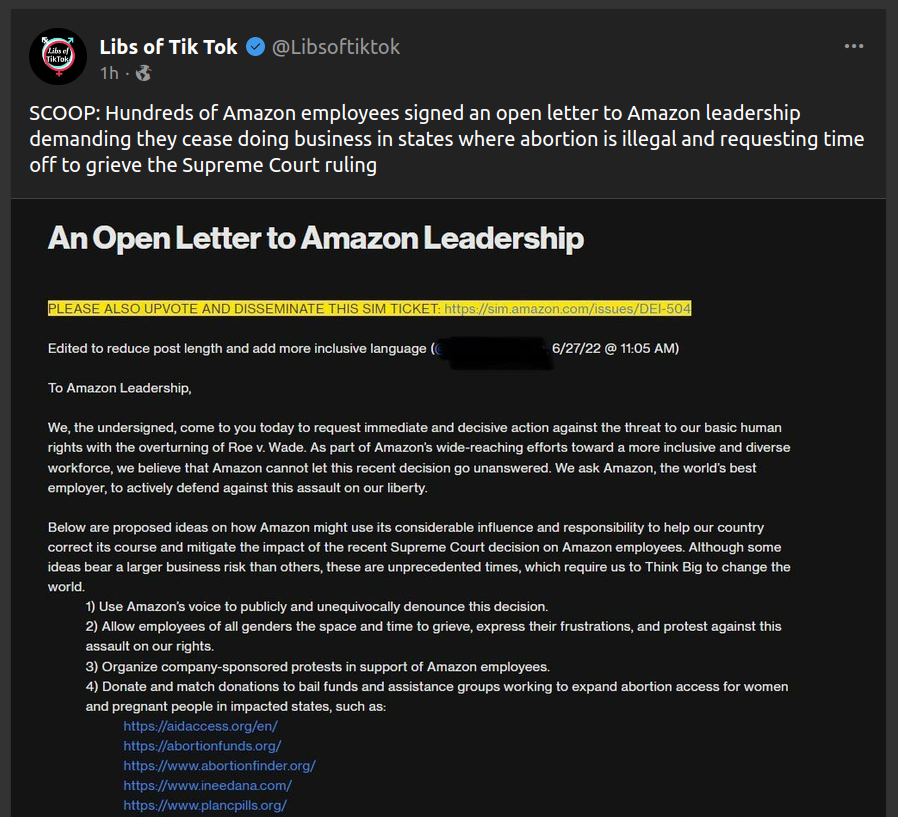 "SCOOP: Hundreds of Amazon employees signed an open letter to Amazon leadership demanding they cease doing business in states where abortion is illegal and requesting time off to grieve the Supreme Court ruling"