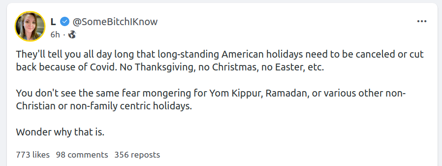 They'll tell you all day long that long-standing American holidays need to be canceled or cut back because of Covid. No Thanksgiving, no Christmas, no Easter, etc.
