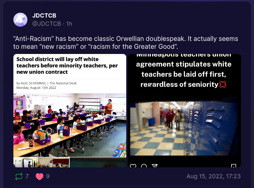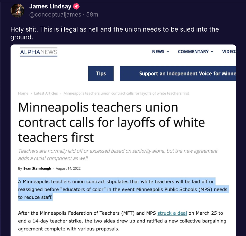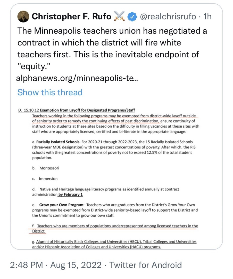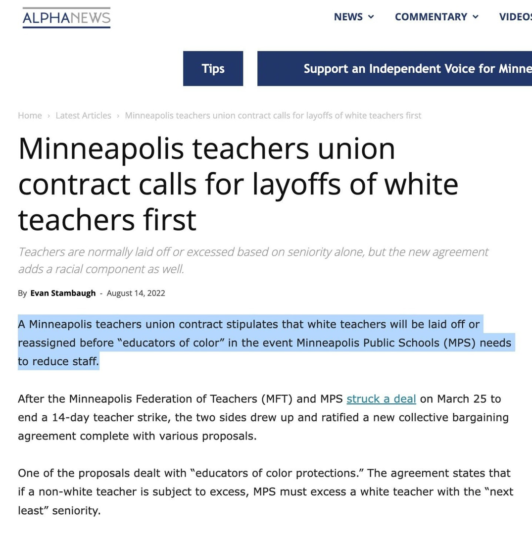 Forum Forums Current Events The War on Whites i... Minneapolis Teacher... Notifications Clear all Minneapolis Teachers Union Contract Stipulates White Teachers Will Be Laid Off First The War on Whites in the USA & Beyond Last Post by Sallie Borrink 3 years ago 4 Posts 1 Users 4 Reactions 316 Views RSS Sallie Borrink (@sallie) Posts: 6885 Illustrious Member Admin Topic starter ♥ Wife, homeschooling mom, conspiracy analyst ♥ Posted : Monday, August 15, 2022 6:14 pm Amanda reacted Topic Tags War on White People Sallie Borrink (@sallie) Posts: 6885 Illustrious Member Admin Topic starter ♥ Wife, homeschooling mom, conspiracy analyst ♥ Posted : Monday, August 15, 2022 6:15 pm Amanda reacted Sallie Borrink (@sallie) Posts: 6885 Illustrious Member Admin Topic starter ♥ Wife, homeschooling mom, conspiracy analyst ♥ Posted : Monday, August 15, 2022 6:17 pm Amanda reacted Sallie Borrink (@sallie) Posts: 6885 Illustrious Member Admin Topic starter https://www.startribune.com/new-minneapolis-teacher-contract-language-disrupts-seniority-to-protect-educators-of-color/600179265/ ♥ Wife, homeschooling mom, conspiracy analyst ♥ Posted : Monday, August 15, 2022 6:18 pm Amanda reacted Super Globals Requests: Server: Options and Features route: community use_home_url: url: https://sallieborrink.com/community/ pageid:145756 default_groupid: 3 2022