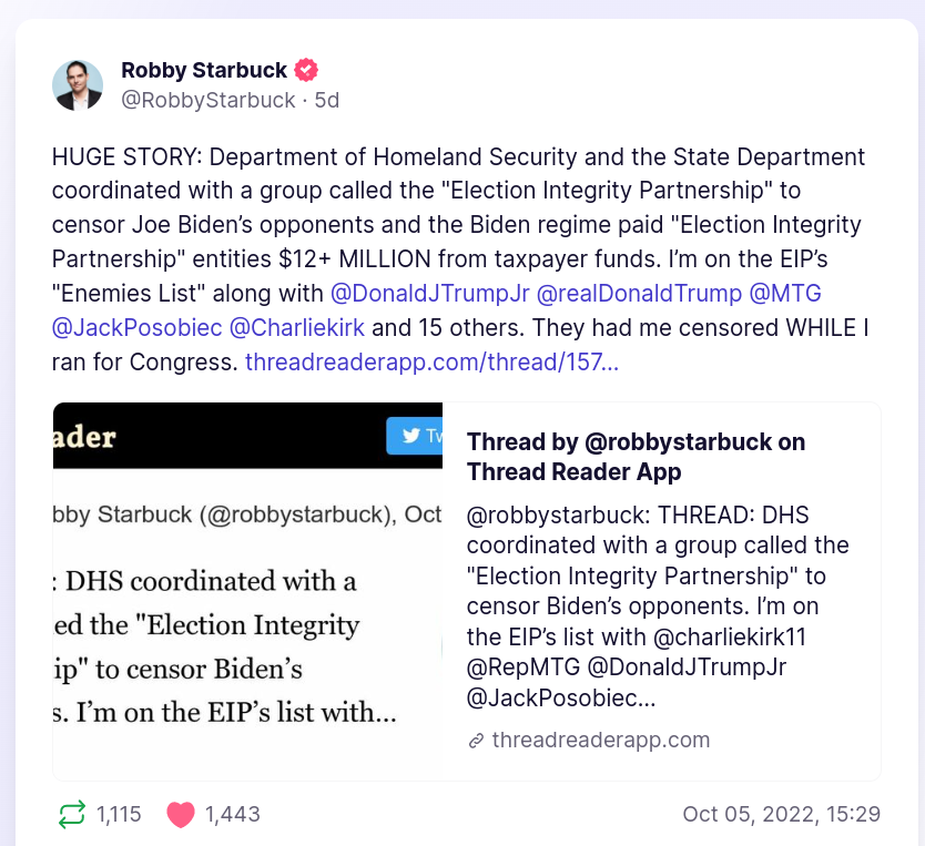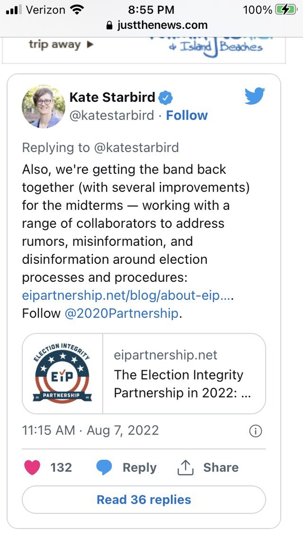 Department of Homeland Security and the State Department coordinated with a group called the "Election Integrity Partnership" to censor Joe Biden’s opponents and the Biden regime paid "Election Integrity Partnership" entities $12+ MILLION from taxpayer funds.