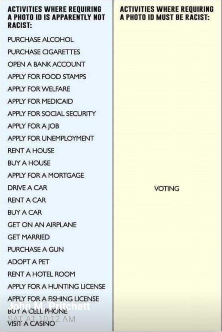 Forum Forums Current Events U.S. Elections Voter ID Summed Up ... Notifications Clear all Voter ID Summed Up in One Graphic (Updated with more detailed list) U.S. Elections Last Post by Sallie Borrink 5 years ago 3 Posts 2 Users 6 Reactions 536 Views RSS Sallie Borrink (@sallie) Posts: 6885 Illustrious Member Admin Topic starter ♥ Wife, homeschooling mom, conspiracy analyst ♥ Posted : Friday, April 2, 2021 4:12 pm Amanda, Kris and Amy C reacted David (@david-b) Posts: 30 Trusted Member Admin Ask black people about the idea. I'd love to see the white liberals in this video watch the response of the black people in this video. Posted : Friday, April 2, 2021 7:11 pm Amy C and Amanda reacted Sallie Borrink (@sallie) Posts: 6885 Illustrious Member Admin Topic starter ♥ Wife, homeschooling mom, conspiracy analyst ♥ Posted : Saturday, April 3, 2021 10:18 pm Amy C reacted Super Globals Requests: Server: Options and Features route: community use_home_url: url: https://sallieborrink.com/community/ pageid:145756 default_groupid: 3 2022