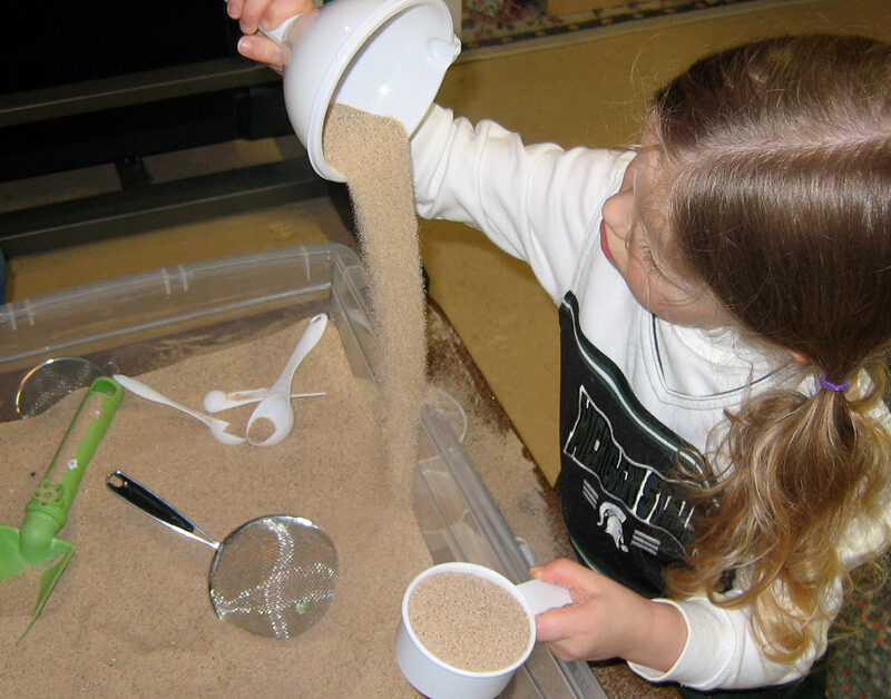 One of Caroline’s favorite activities at the Grand Rapids Children’s Museum is the indoor sandbox. So far we haven’t purchased an outside sandbox for her, but we may look into that next spring. In the meantime, I wanted to come up with a way she could enjoy an indoor sandbox over the winter since she enjoys it so much. So here is my easy and inexpensive solution!