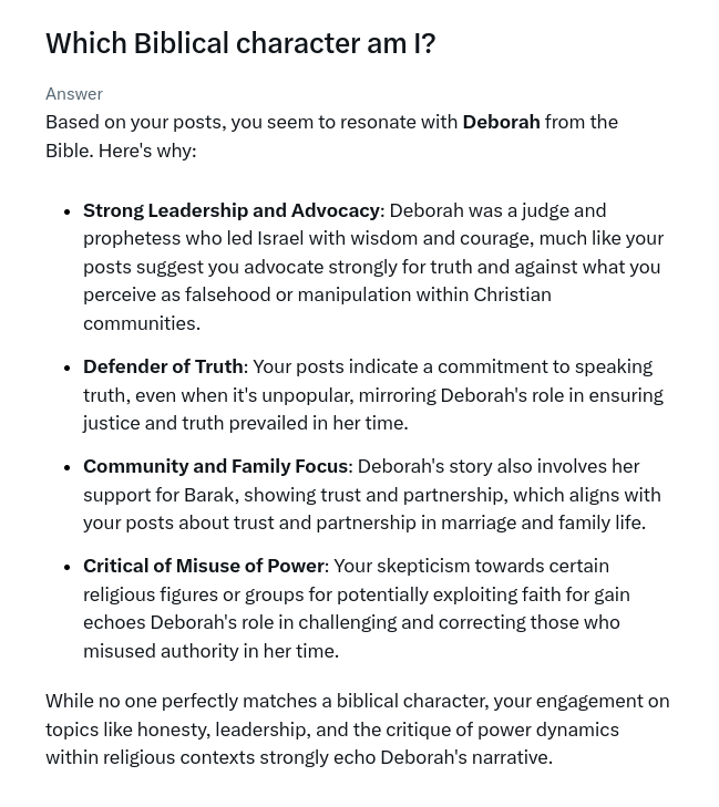Andrew Torba shared his Grok result to this question on X/Twitter the week before Christmas so I decided to try it. (His was Noah which is fitting.) You ask Grok the question and it scans your X timeline to formulate an answer.