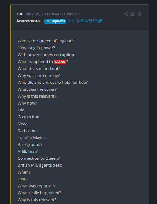 First, this is Drop 100. Read through it before you watch the first video about Diana. Remember that the purpose of the drops was to get the anons to dig for information. That’s why there are so many questions. There is also lots of symbolism and information in the video so feel free to ask in a comment if you wonder why something was included.
