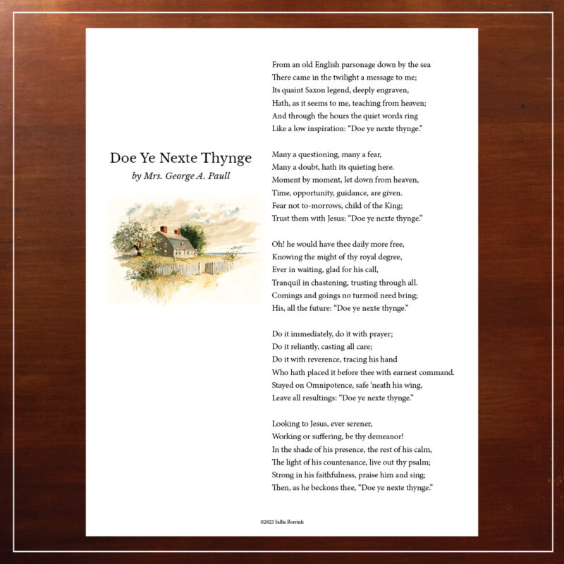 The classic poem “Doe Ye Nexte Thynge” by Mrs. George A. Paull was popularized by Christian author, Elisabeth Elliot.