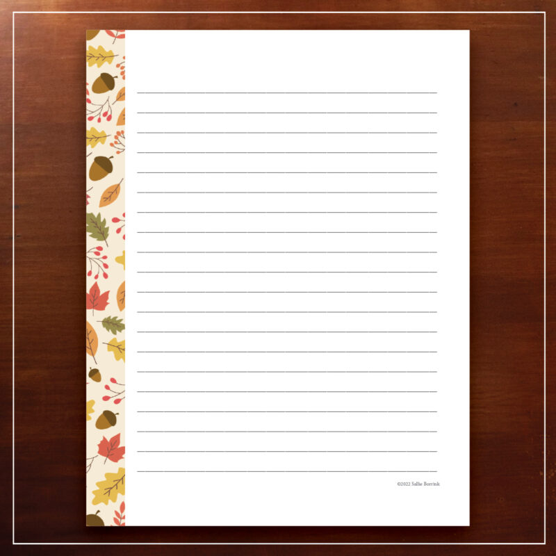 Enjoy this free fall-themed journal page featuring acorns and colorful autumn leaves. Print it off and use it for journaling, notes, grocery lists, and more.
