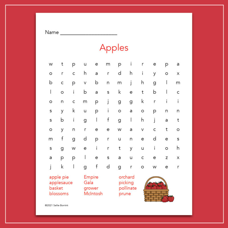 Welcome the arrival of fall with this free printable Apples word search. This is a fun activity to add to your homeschool learning time. It features a cute basket of delicious red apples.