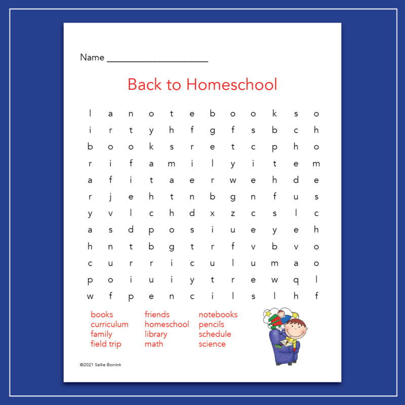Celebrate a new year of learning with a free printable Back to Homeschool word search. This is a fun activity to add to your homeschool learning time. The worksheet features a boy being creative at home.
