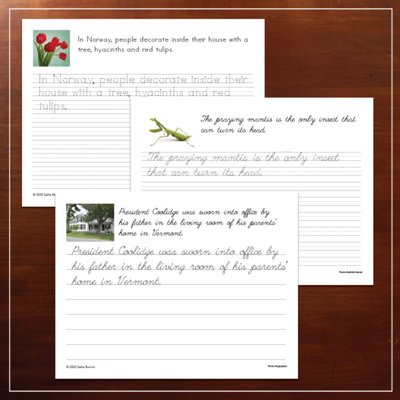 This Free Copywork Sampler for homeschoolers combines all sorts of interesting fun facts about the world with handwriting practice. The copywork set includes both print and cursive. There are three line options so you can use whichever ones work for your family.