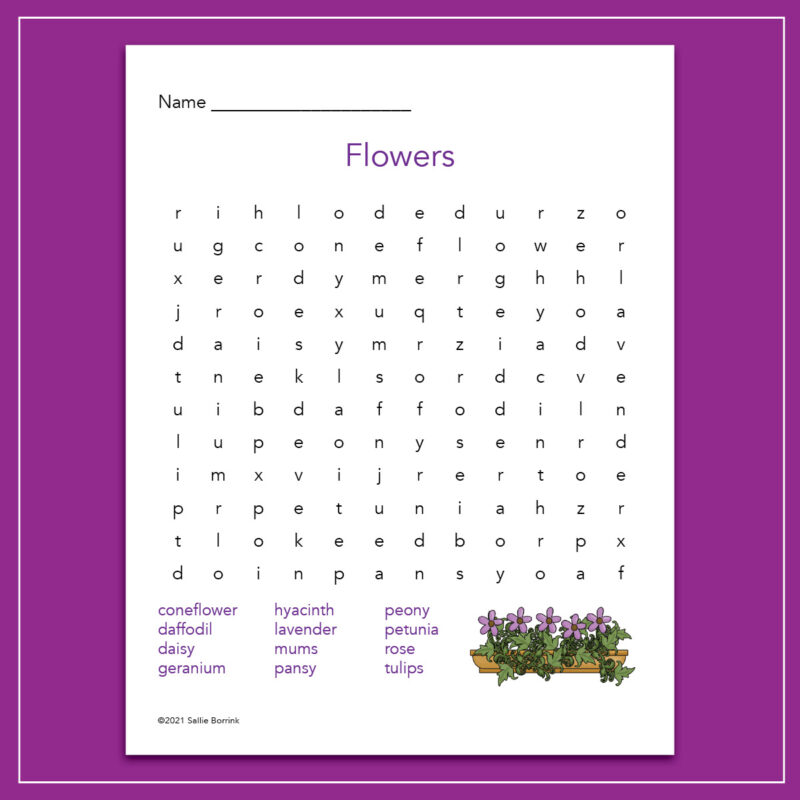 Celebrate spring and growing things with this free printable flowers word search. The printable features cheerful purple flowers in a planter. This is a fun worksheet to add to your homeschool learning time.