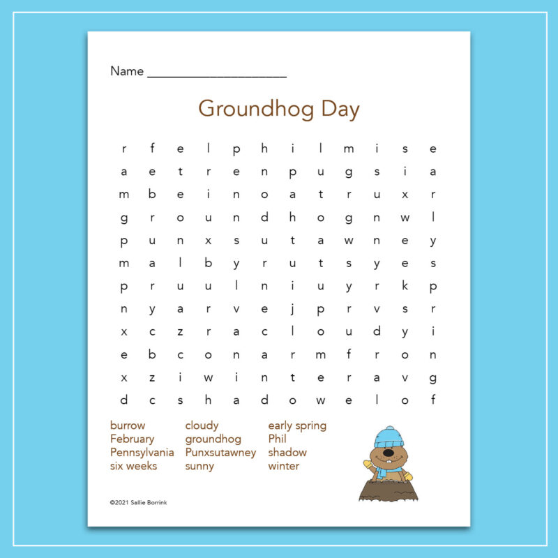 Use this free printable Groundhog Day word search as part of your homeschool learning time this February. The worksheet features a cute little groundhog peaking out.