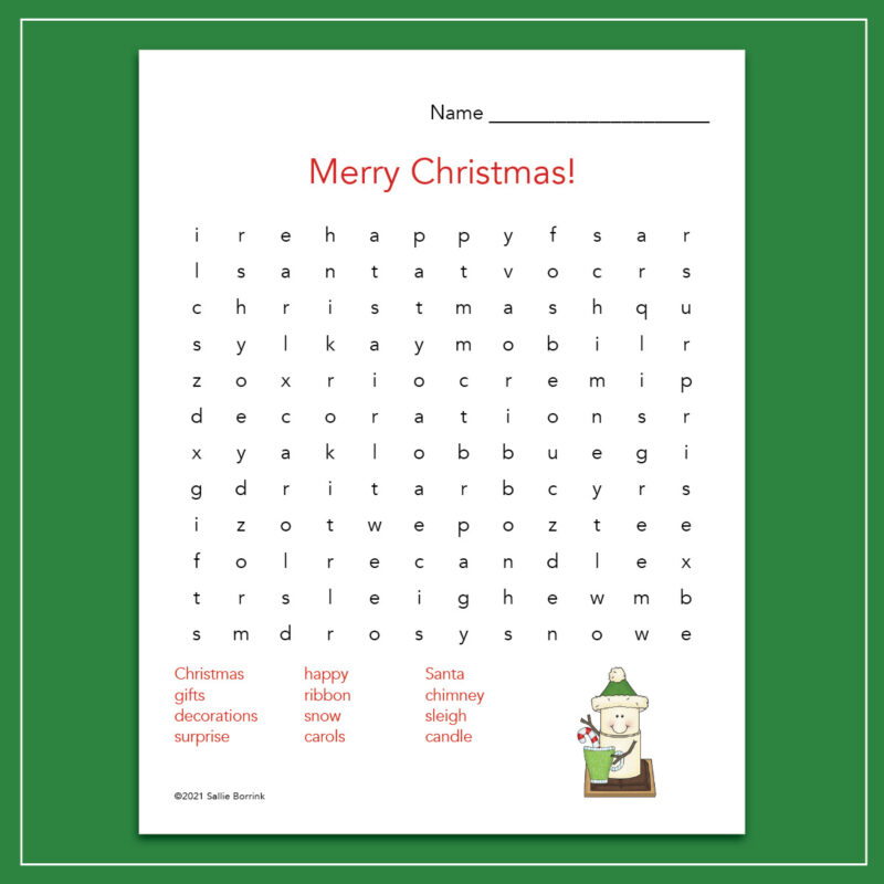 Make this free printable Merry Christmas word search part of your homeschool activities in December. It features a cheerful little marshmallow guy.Â