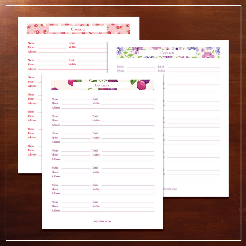 These free printable address pages includes the most important information you will want to record regarding your contacts. There are three pretty designs so you can chose the one you like the best or use different designs for different groups of contacts.