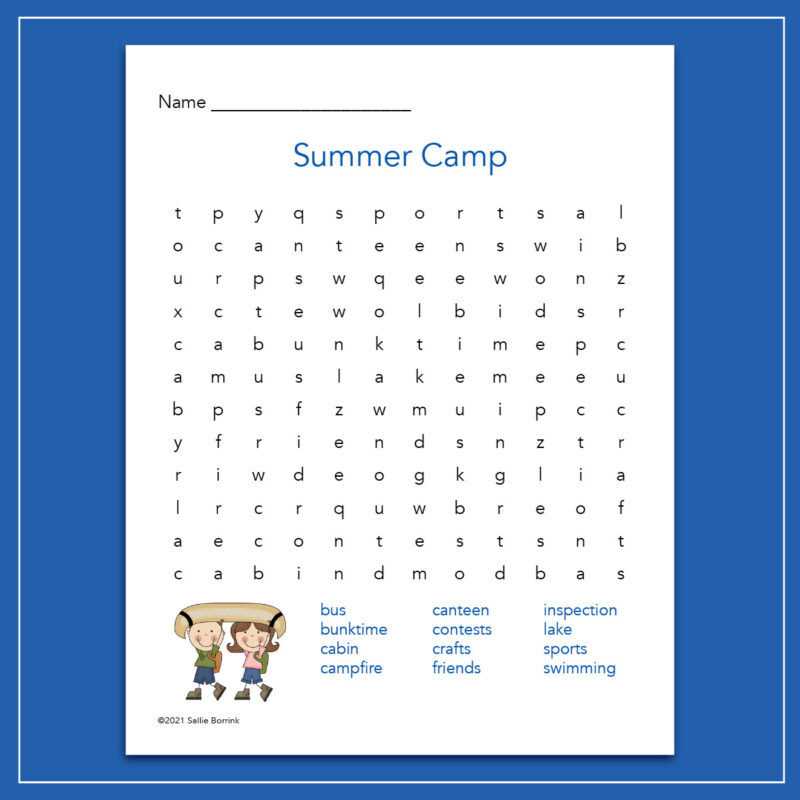 Welcome the arrival of summer with this free printable summer camp word search. This is a fun activity to add to your homeschool when someone needs a little something to do. The summer camp themed word search features a boy and a girl carrying their canoe